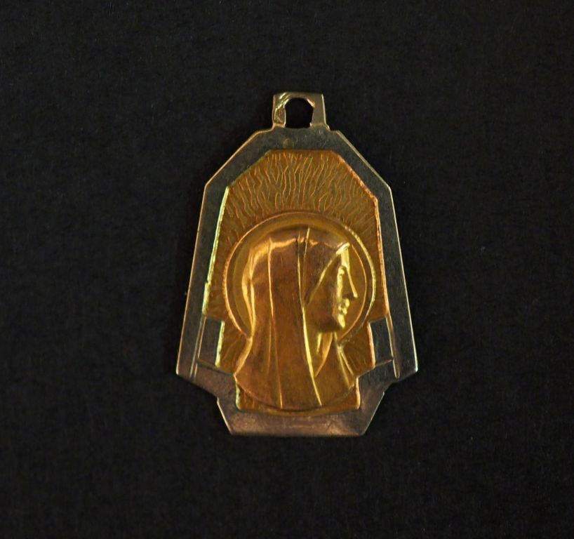 Petite médaille religieuse de style Art déco deux tons d'or, figurant la Sainte Vierge de profil. 1,7 x 1,4 cm Poids. 0,83 g