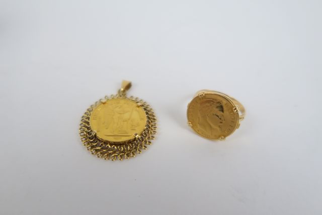 Pièce de 20 Francs or, montée en bague. 6 g. Pièce de 20 Francs or montée en pendentif. 10 g.