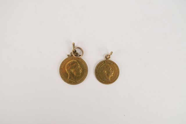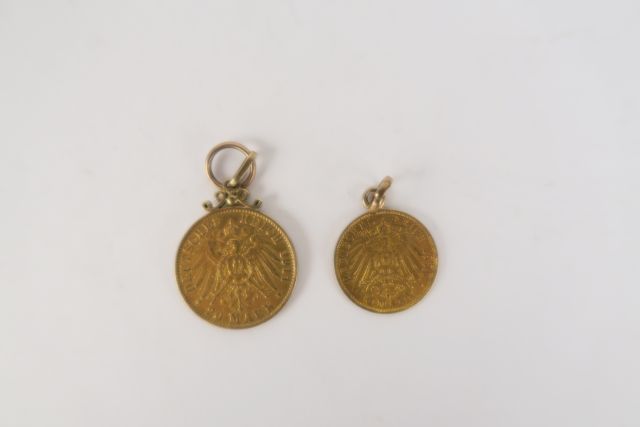 Pièce de 20 marks et une pièce de 10 marks en or, les deux montées en pendentifs. 12 g tel