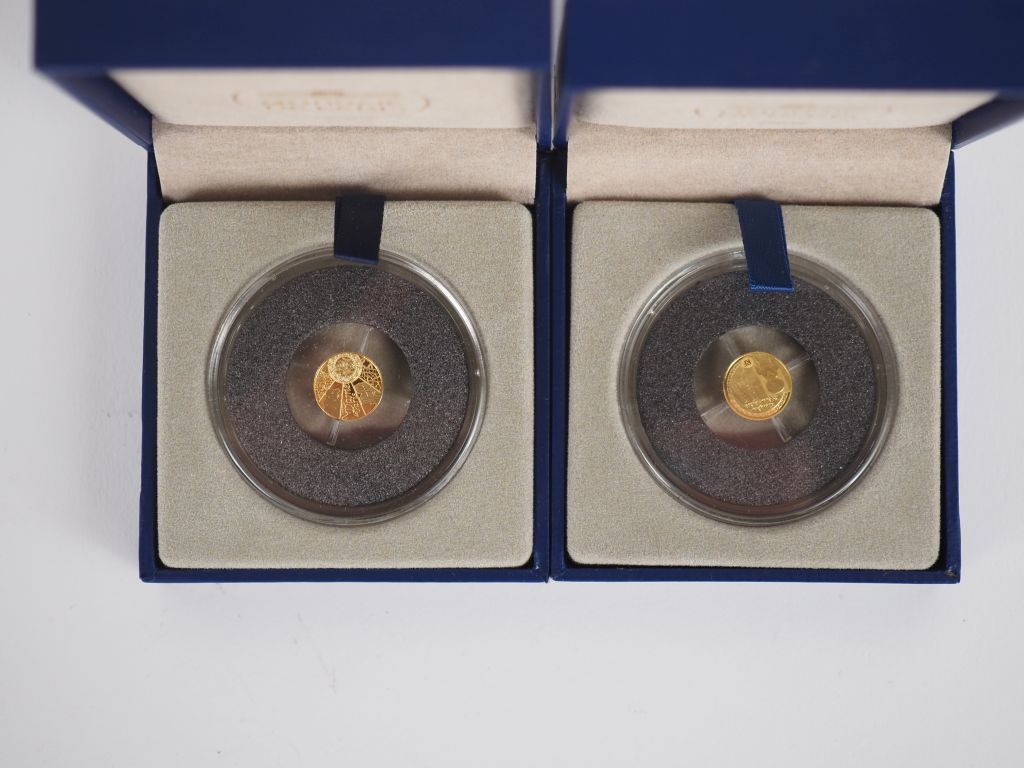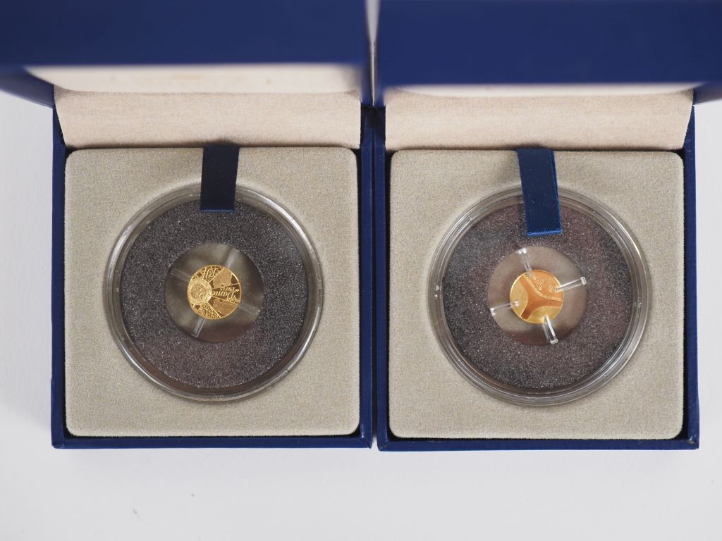 Pièce de 5 euros Egypte 2012 en or 999, monnaie de Paris, dans son écrin. Poids.0,5 g. On y joint une pièce de 5 euros 2013 Unesco 850 de Notre Dame de Paris en or 999. Poids. 0,5 g.