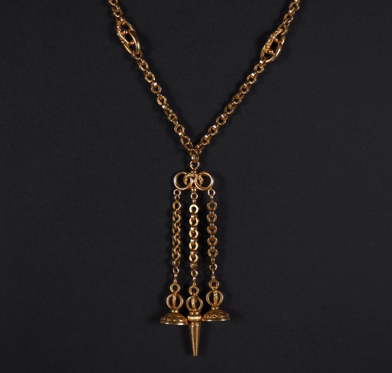 Ravissant collier en or jaune 750, maille jaseron, agrémenté de trois pendeloques. Long. 41 cm Poids tel. 21,82 g (rallongé avec une maille légèrement différente)