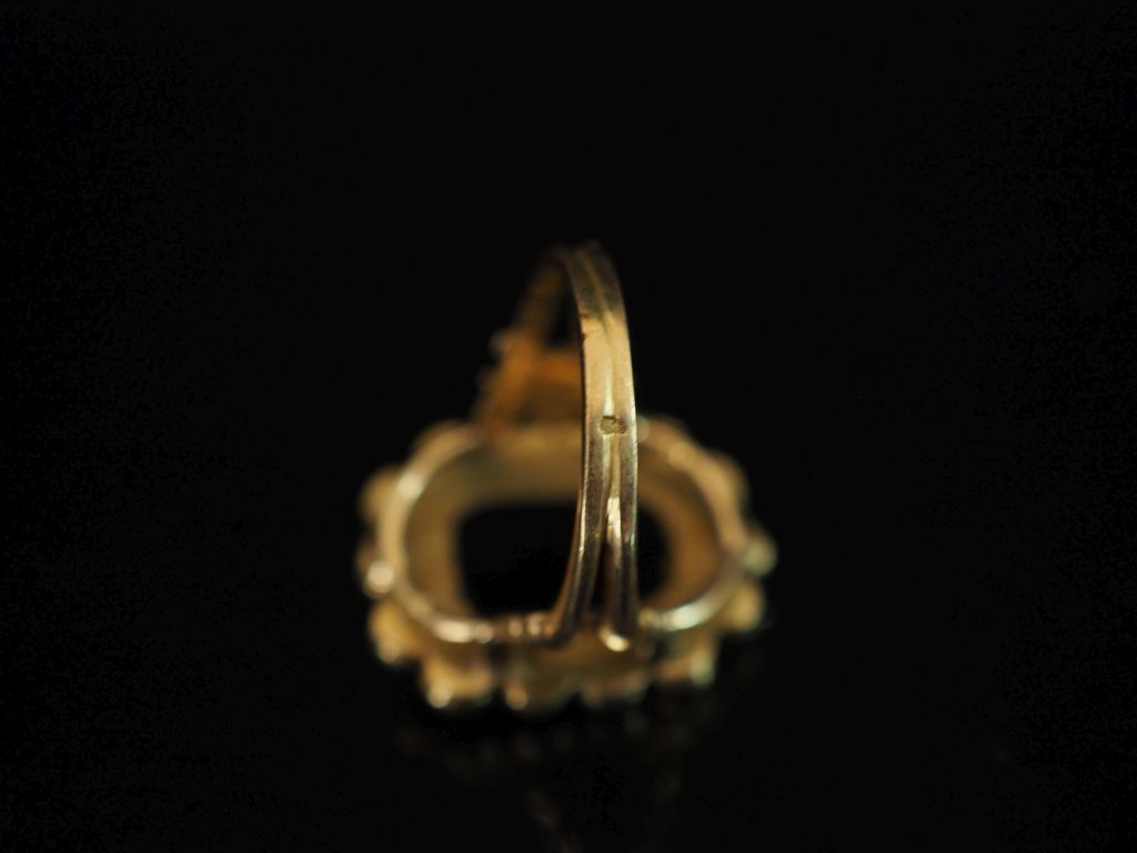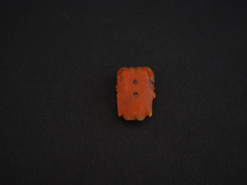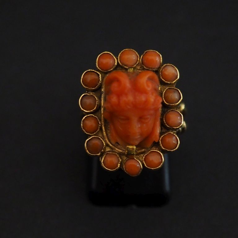 Ravissante bague Napoléon III en or jaune 750, sertie en son centre de corail figurant un masque de jeune femme entouré de corail en cabochon. Jolie monture ajourée. TDD. 53 Poids tel. 7,57 g Poids tel. Sans le motif central : 6,42 g (motif central à refixer)