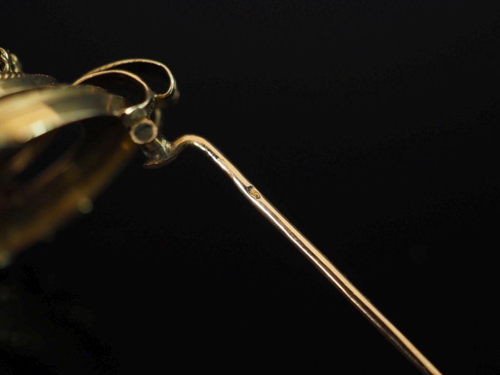 Ravissante broche en or jaune 750, sertie en son centre d'une pierre mauve agrémentée en son centre d'une petite perle blanche dans un entrelac. Diam. 3,5 cm Poids tel. 10,64 g