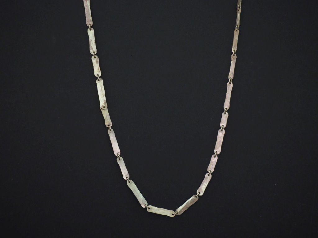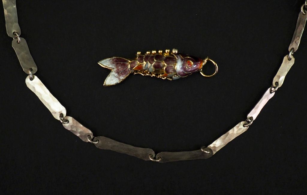 Sautoir en argent, à décor de maillons rectangulaires à bords arrondis et légèrement martelés. Long. 82 cm Poids. 17,80 g On y joint un pendentif articulé en métal doré et émail polychrome en forme de poisson. H. 4 cm (petits sauts d'émail)