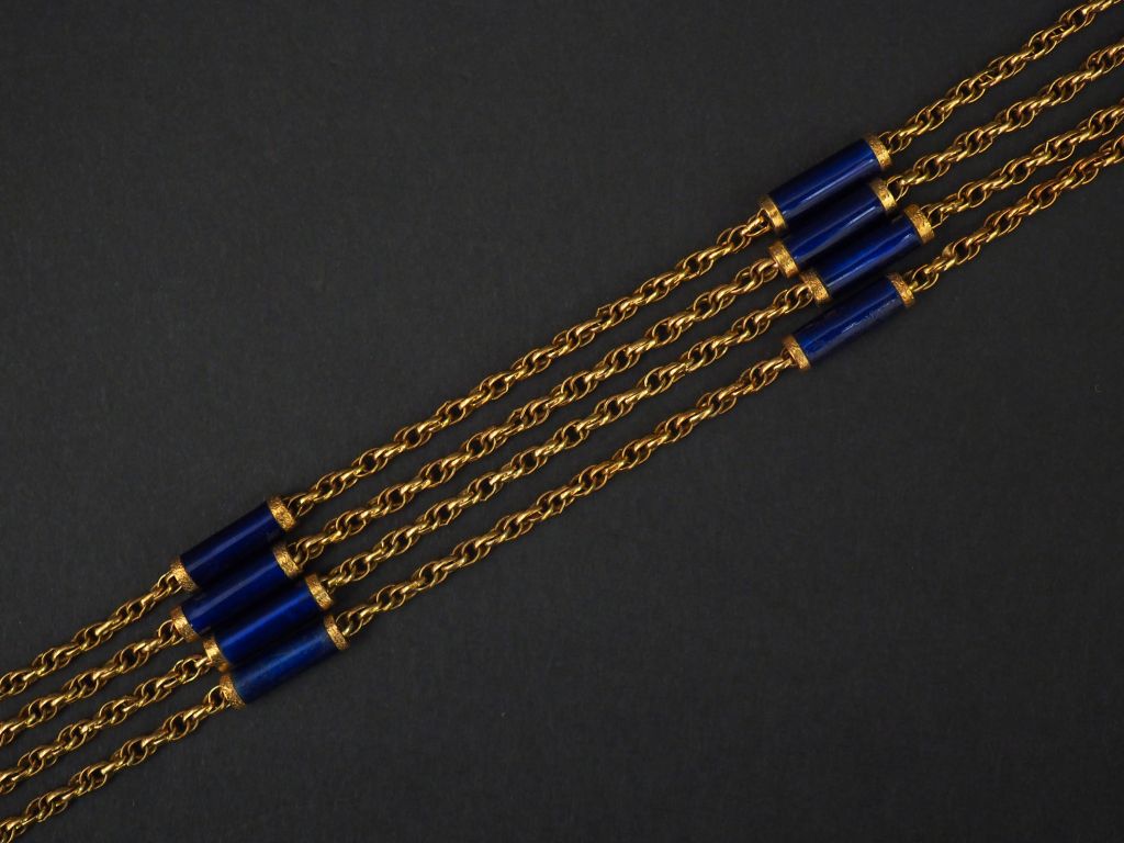 Sautoir en or jaune et émail bleu, petits maillons entrelacés alternés de maillons cylindriques. Long. 109 cm Poids tel. 31,05