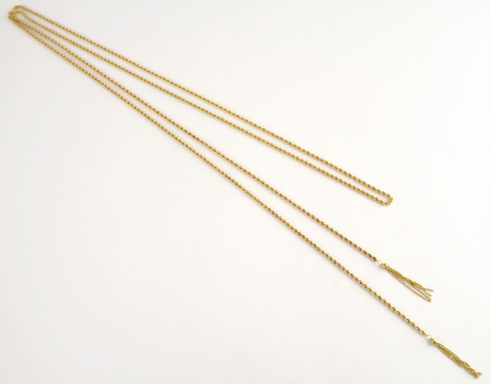 Sautoir en or, maille torsadée, se terminant comme de la passementerie. Poids : 8,4 g