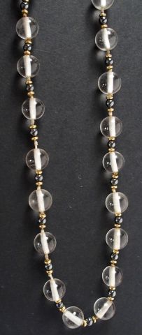 Sautoir et bracelet en perles de verre, perles grises et dorées.