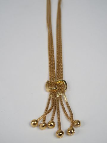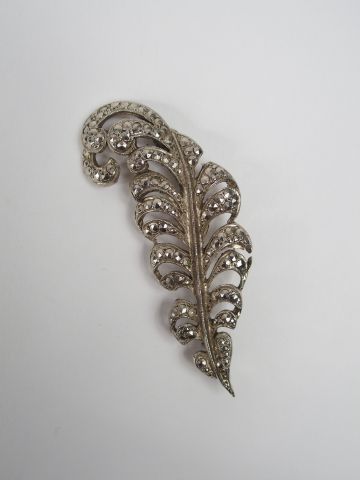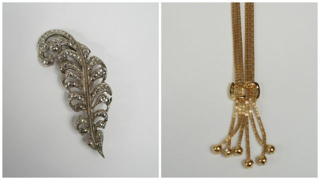 Sautoir fantaisie en métal doré maille tube et pendentif pavé de pierres à l'imitation du diamant. On y joint une broche en métal argenté en forme de plume, pavée de strass.