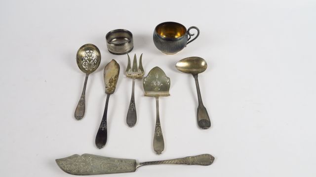 Service à douceurs 4 pièces de style Empire en argent, poinçon Minerve, une cuillère à bouillie, un couteau à décor gravé de fleurs, une tasse et un rond de serviette en argent ciselé. Poids : 290 g