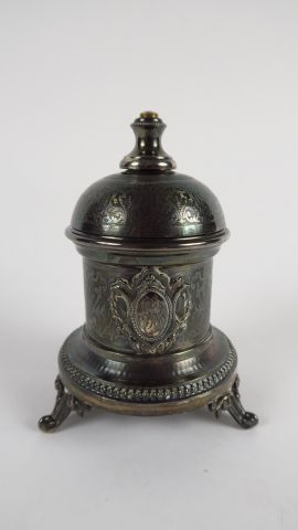 Sonnette de table en argent, poinçon Minerve, à décor guilloché et monogrammée dans un cartouche (manque le poussoir). Poids tel : 365 g