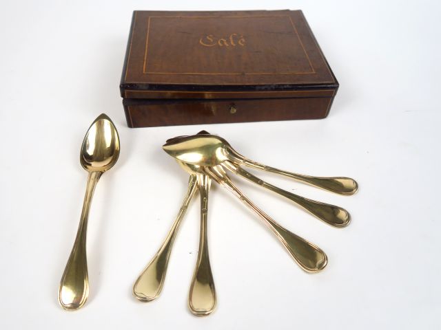 Suite de 6 cuillères en vermeil, poinçon Vieillard. Poids : 135 g. Dans un coffret marquetté et marqué 'Café' (couvercle voilé)