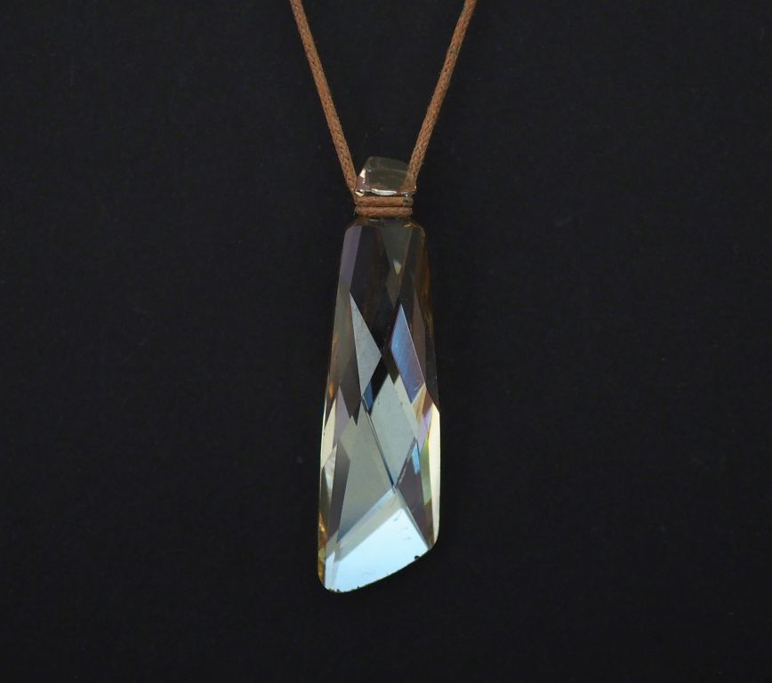 SWAROVSKI Pendentif en cristal fumé. Cordon marron. Signé du monogramme de la marque. H. 5 cm (petites égrenures)