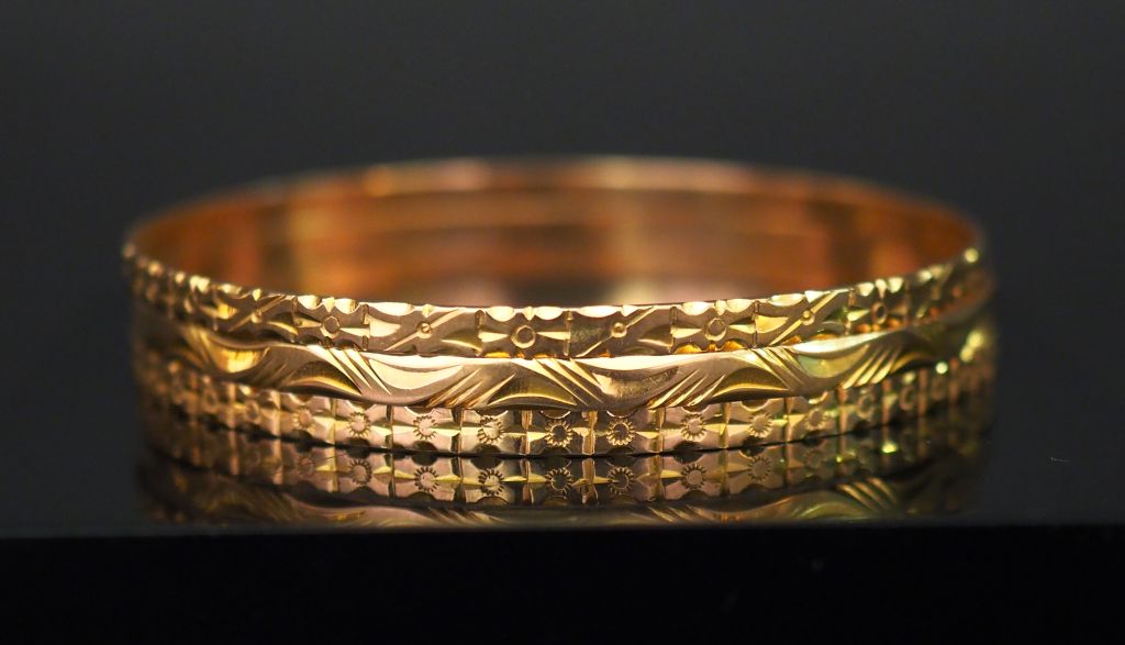 Trois bracelets jonc en or jaune, à décor de frises de fleurs, motifs géométriques et vaguelettes. Diam. 5,6 cm Poids. 16,07 g
