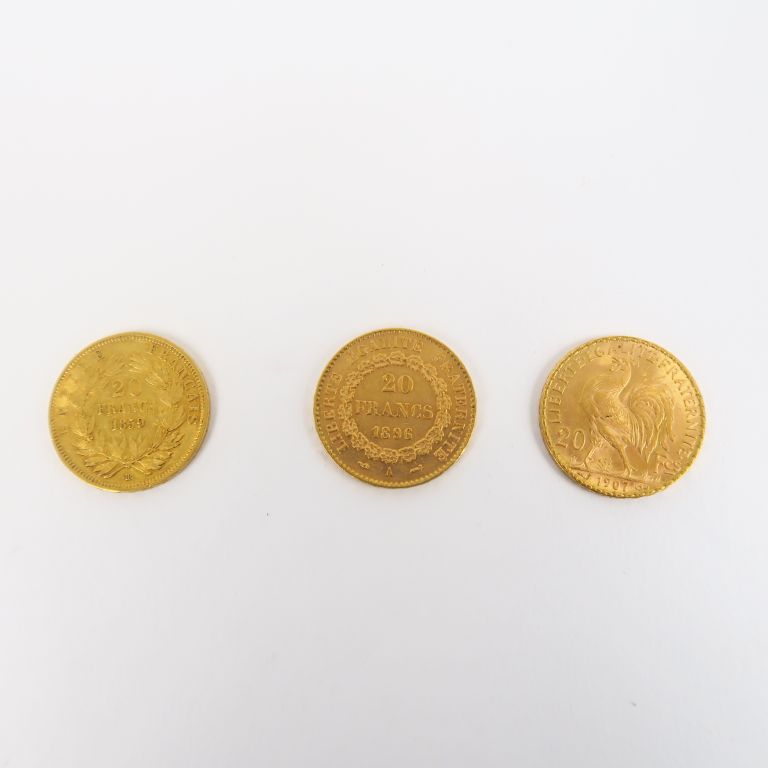 Trois pièces de 20 Francs or, 1859, 1896-A et 1907. FRAIS ACHETEURS : 5% TTC