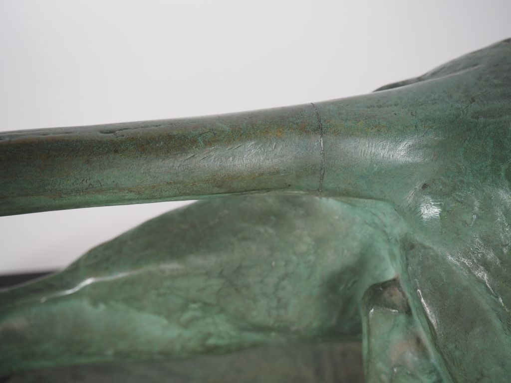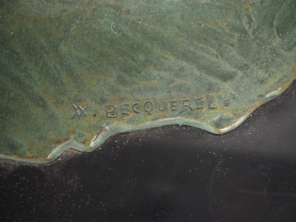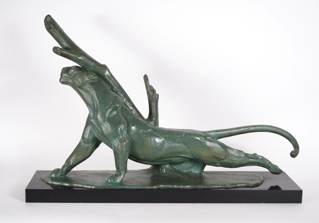 André Vincent BECQUEREL (1893-1981) « Panthère se frottant à un arbre ». Épreuve en bronze à patine vert antique nuancée sur socle quadrangulaire en pierre noire. Signé AV Becquerel dans le bronze. (petite restauration à la base de la queue ?) Historique : André Vincent Becquerel, élève d’Hector Lemaire dans un premier temps puis de Prosper Lecourtier dans un second temps, exposera régulièrement au Salon des Artistes Français entre 1914 et 1922. Dim. 51 x 76 cm Expert : Amélie MARCILHAC