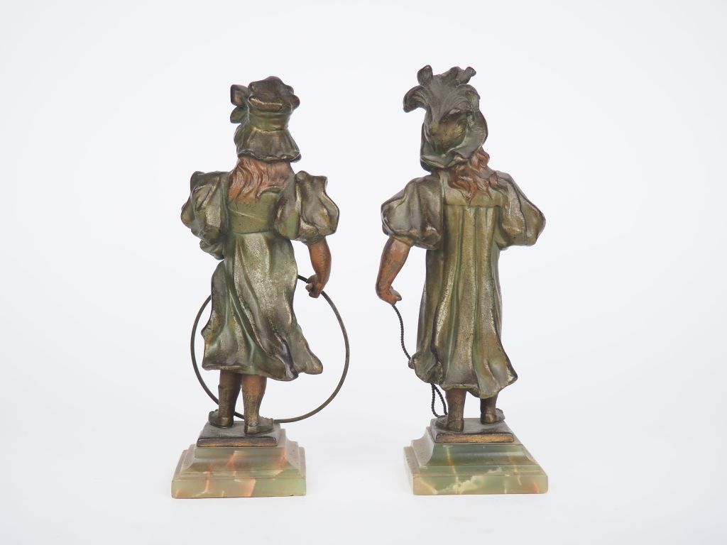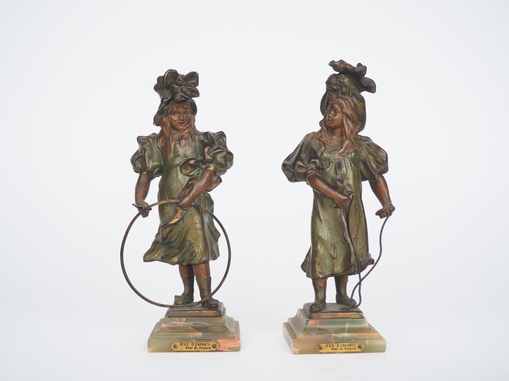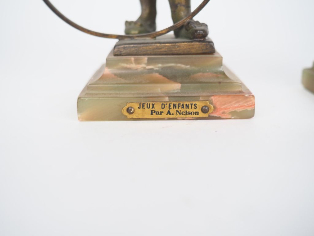 Antoine NELSON. "Jeux d'enfants". Paire de sujets en régule à double patine, socles en onyx. H. 17,5 cm.