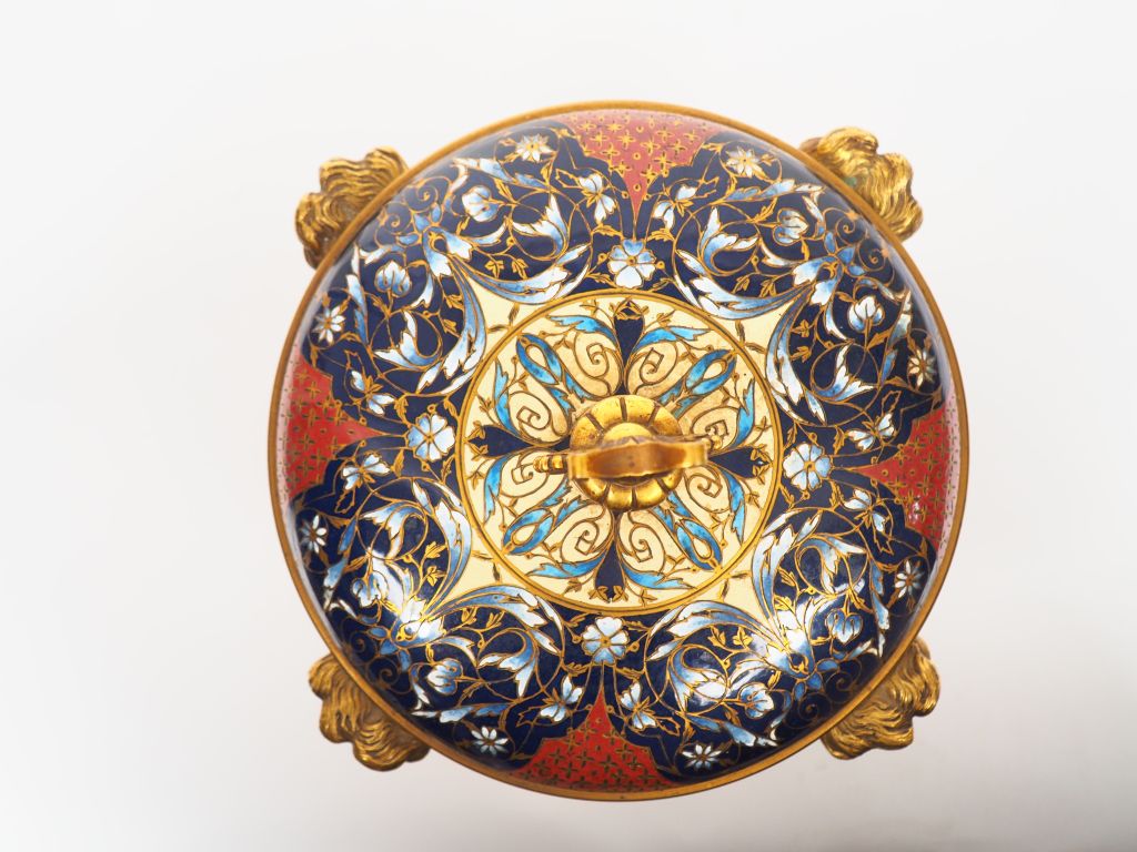 Barbedienne (attribué à). Coupe couverte à quatre pieds en bronze doré et émaux polychromes, à décor de rinceaux feuillagés, de mufles de lion, petit socle en albâtre. H. 20 cm