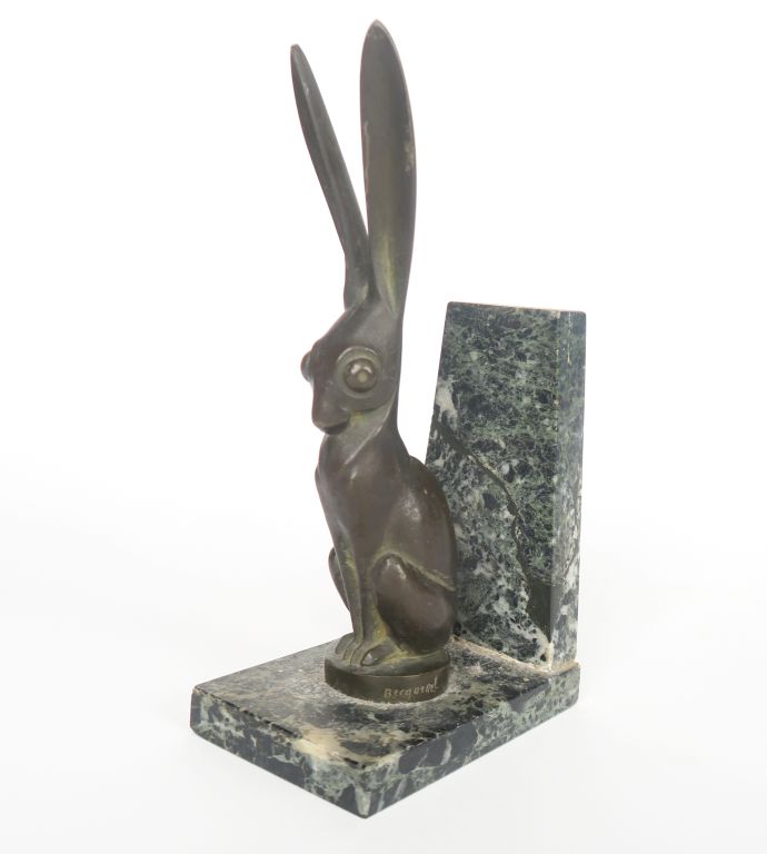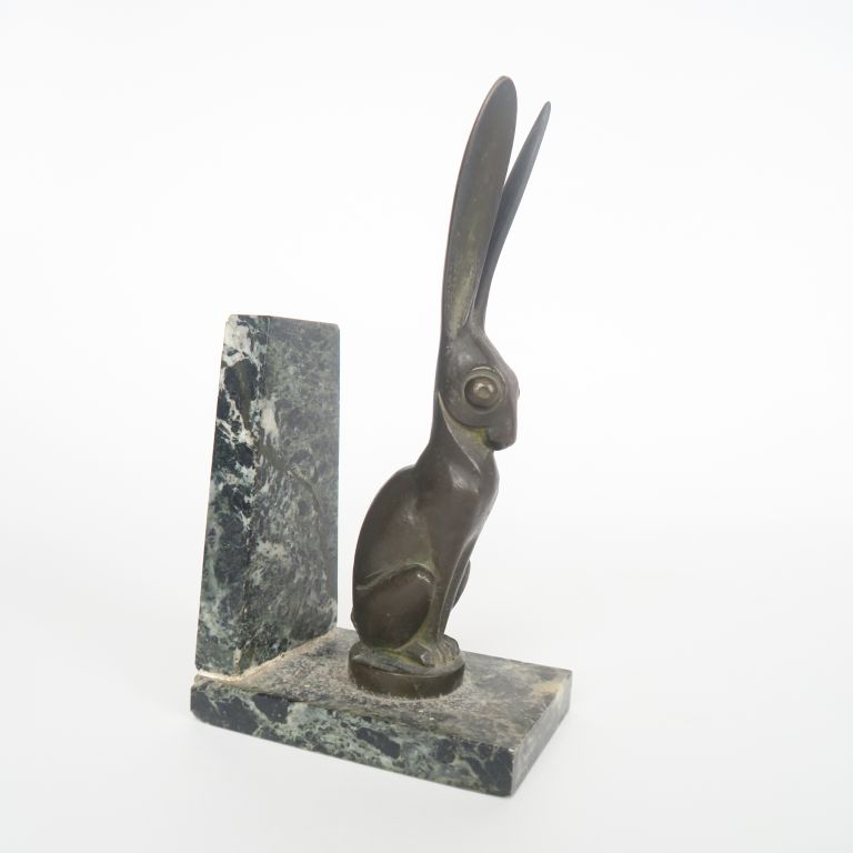 BECQUEREL. "le lièvre" Mascotte en bronze à patine brune fonte Etling, à Paris , socle en marbre vert. Signée H. avec le socle : 20,5 cm H. du socle : 1,5 cm