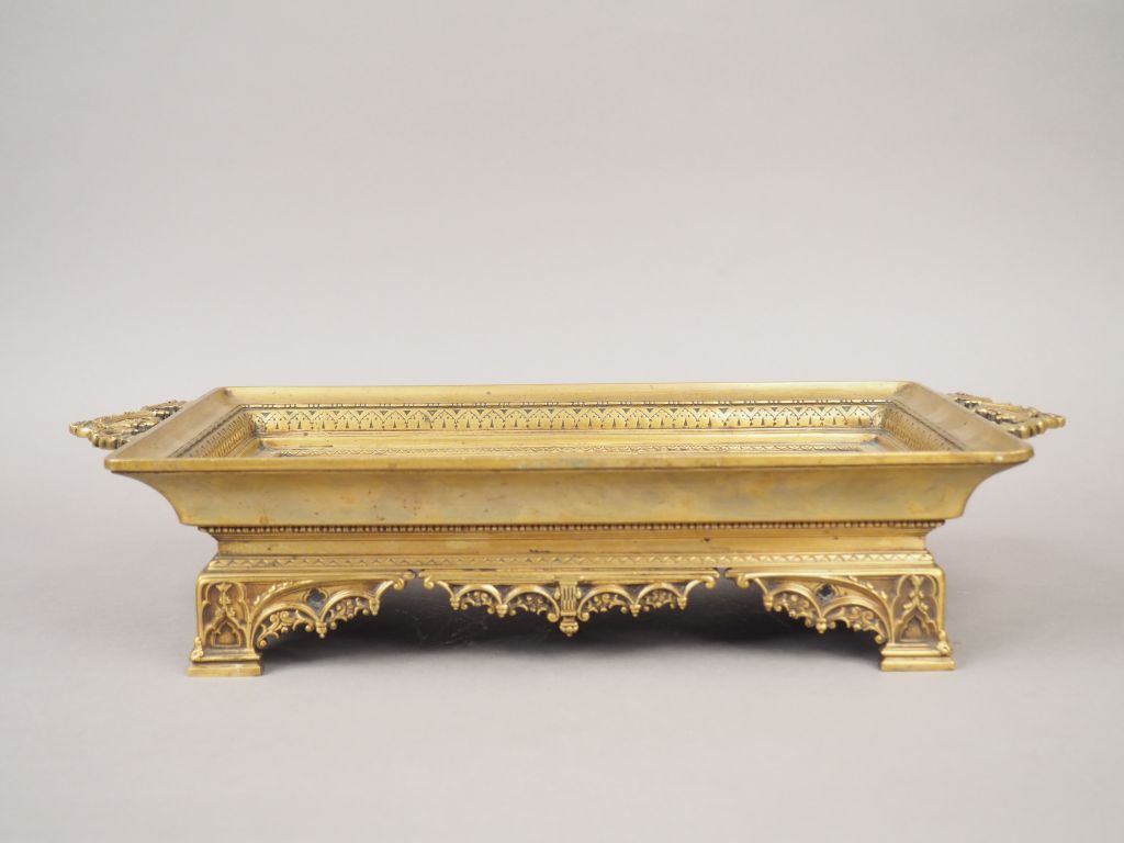 E. PICAULT. Grande coupe en bronze à décor de scène de cour égyptienne et de frises de motifs géométriques. Dim. 49 x 24,5 x 10,5 cm