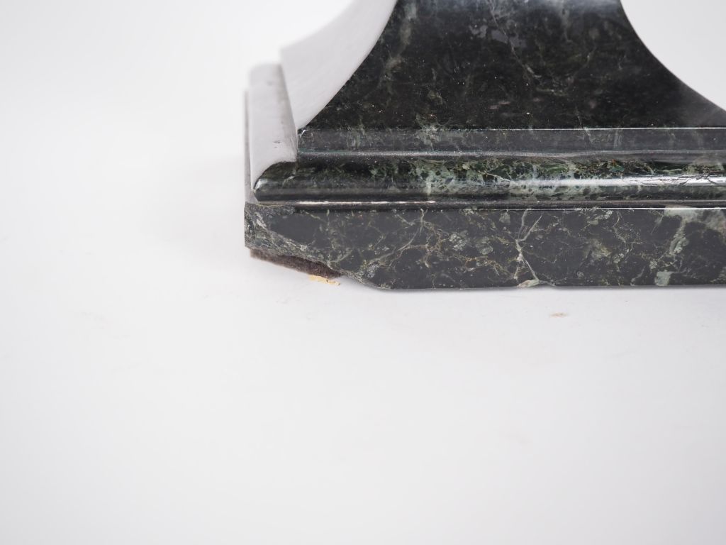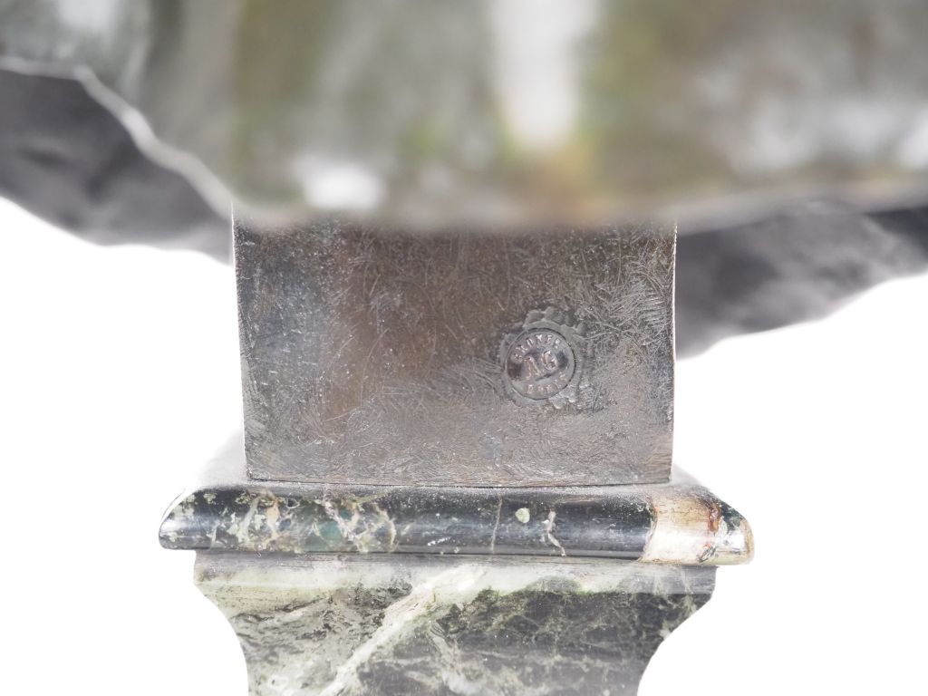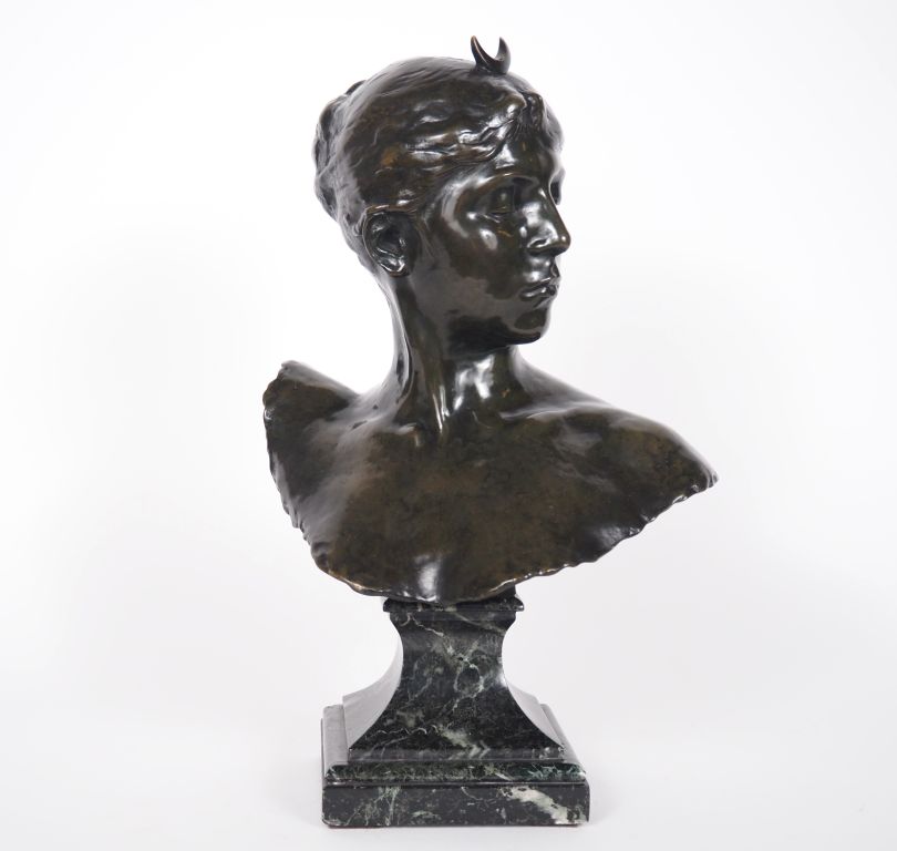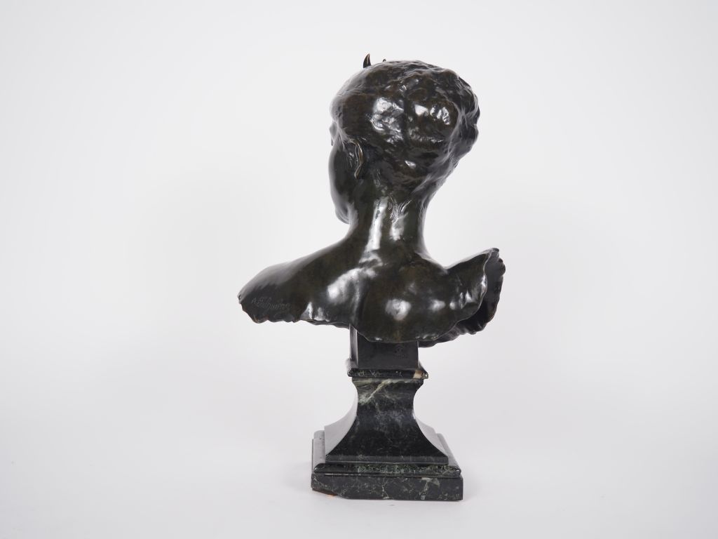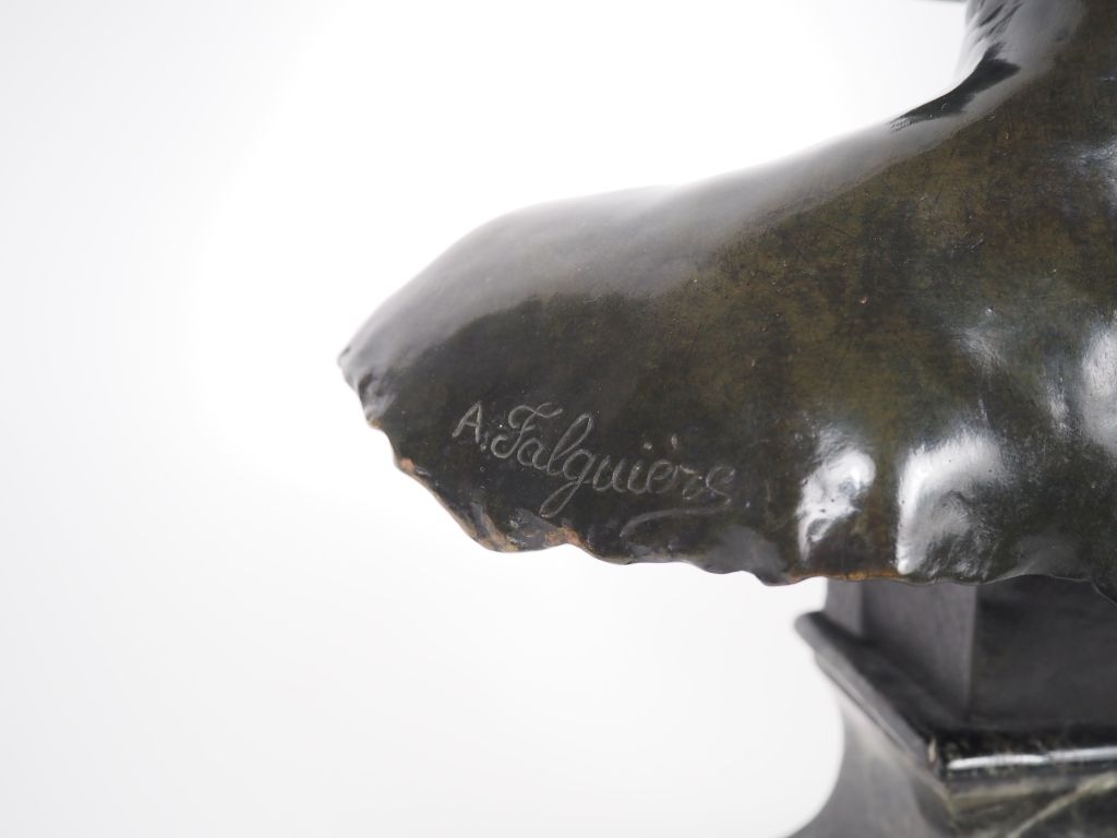 FALGUIERES. "Diane chasseresse" Sculpture en bronze, à patine brune sur un socle en marbre vert de mer. H. 35 cm Signée (égrenure à l'arrière du socle)