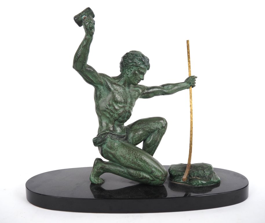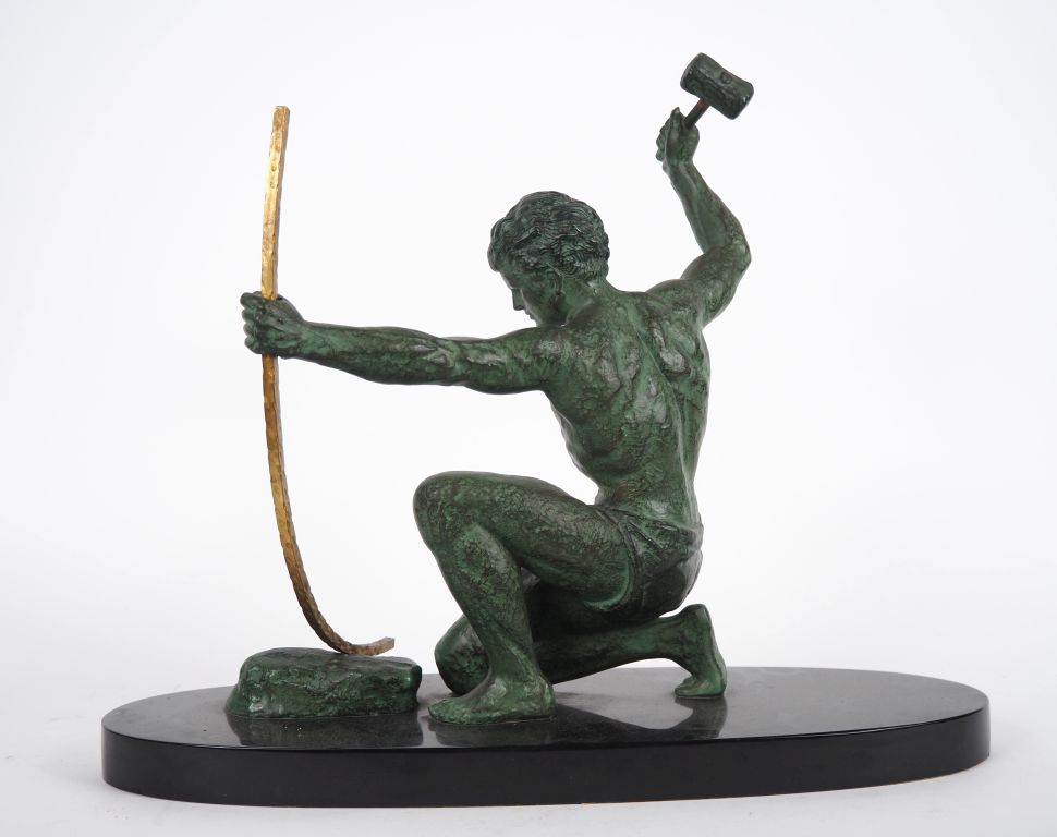 G. HERVOR. "Héraclès" Sculpture en bronze à patine verte, sur un socle en marbre noir. Signé sur la terrasse. H. totale : 39,5 x 50 cm