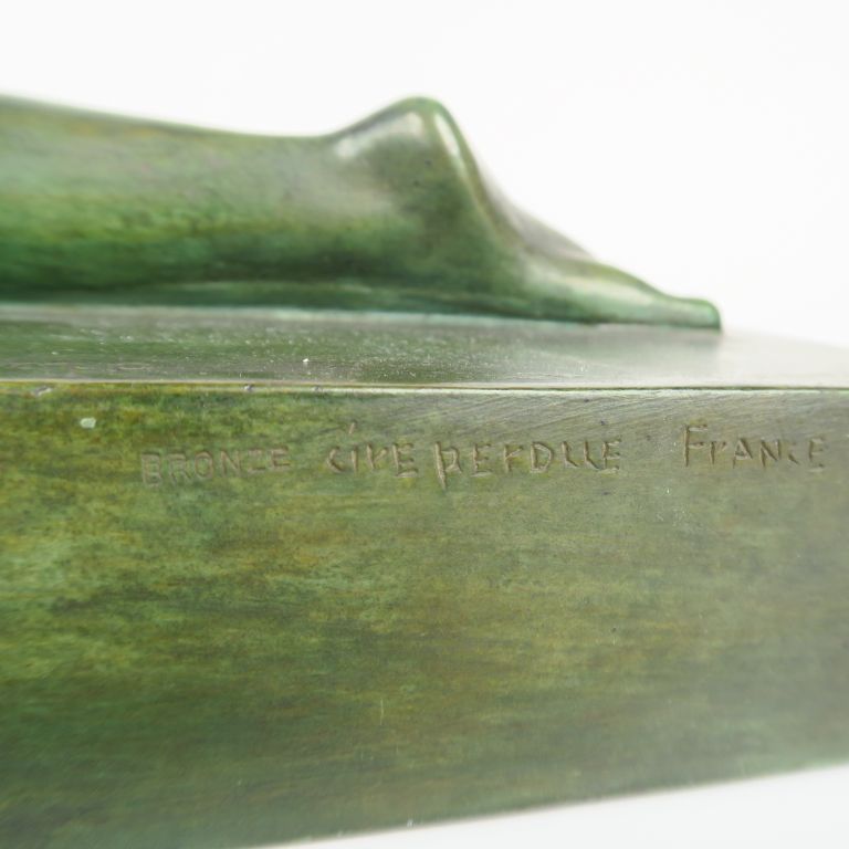 GUERO. "Archère". Sculpture Art déco en bronze à patine verte. Signée Dim. 31 x 71 x 14 cm
