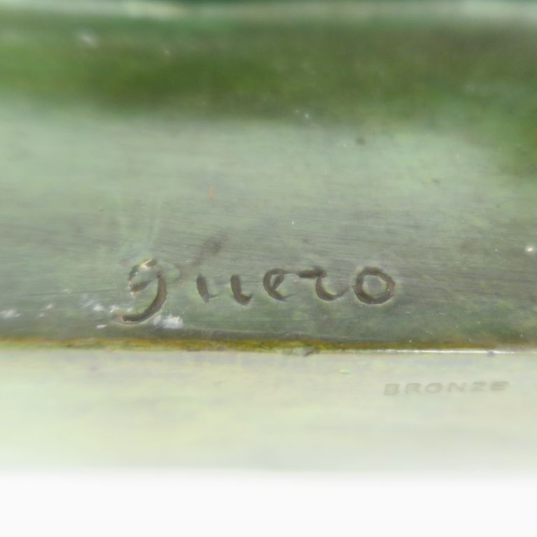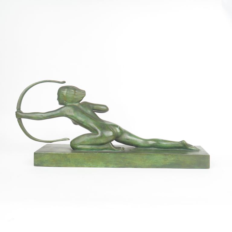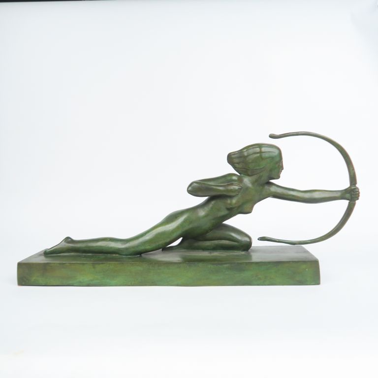 GUERO. "Archère". Sculpture Art déco en bronze à patine verte. Sig...