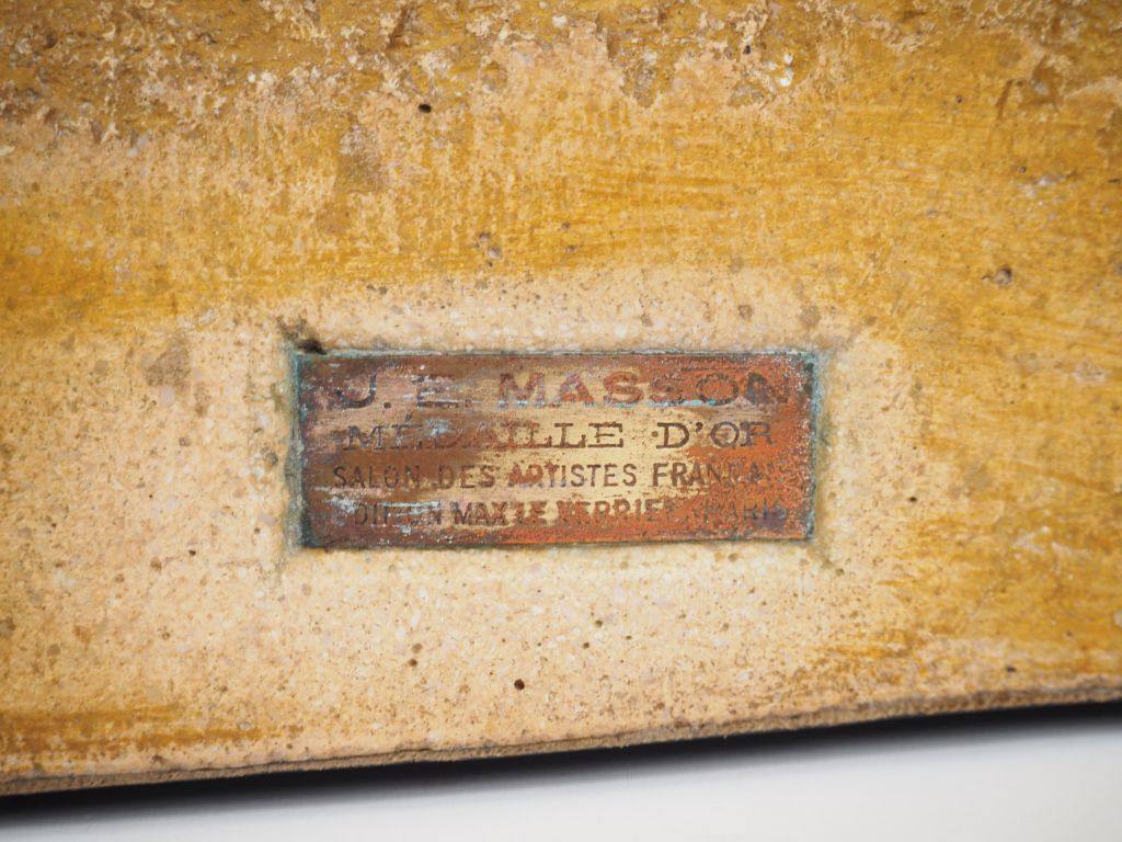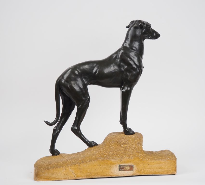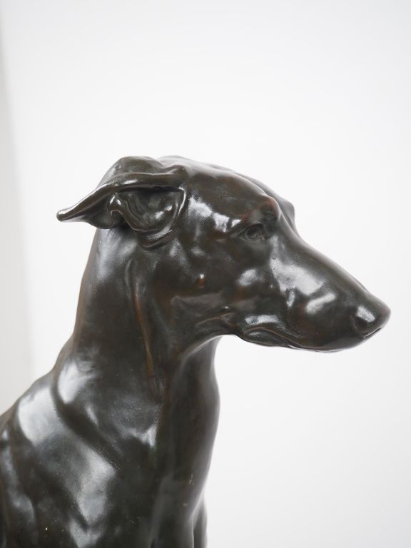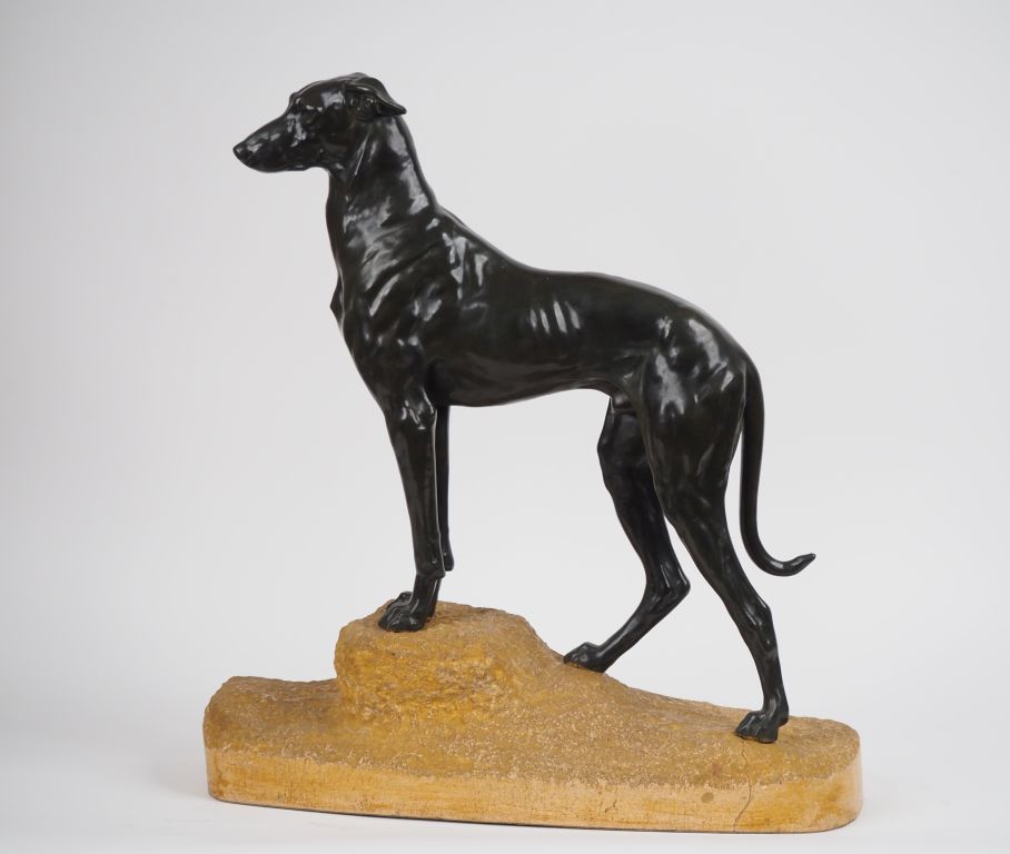 MASSON. "le lévrier". Grande sculpture en bronze à patine brune sur un socle en pierre ou pierre reconstituée (fendu) H. du bronze : 41 cm H. avec le socle : 56 cm largeur du socle : 50 cm Signé dans un cartouche