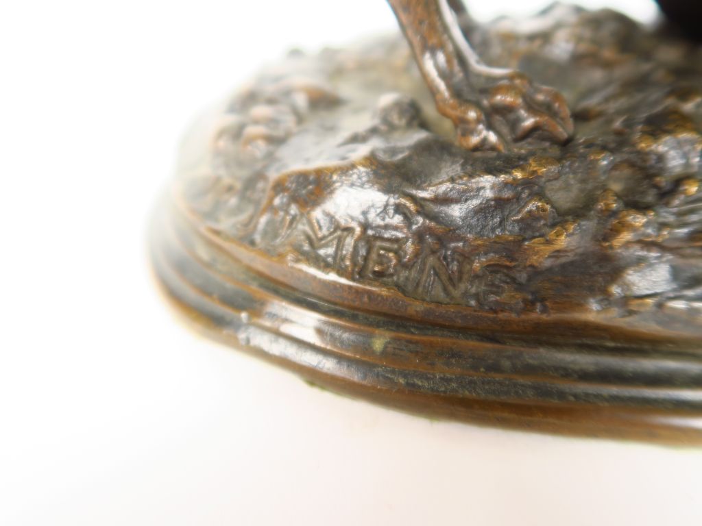 P.J. MENE. "Chien à l'affut". Sculpture en bronze à patine brune et datée 1858. Signée. Dim. 13,5 x 19 cm