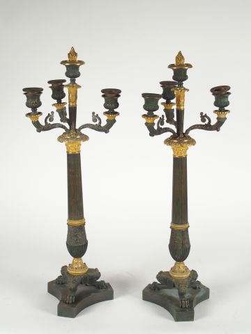 Paire de candélabres de style Restauration éclairant à quatre lumières en bronze à triple patine, à décor de feuilles d'acanthe, piétement griffe. H. 55 cm