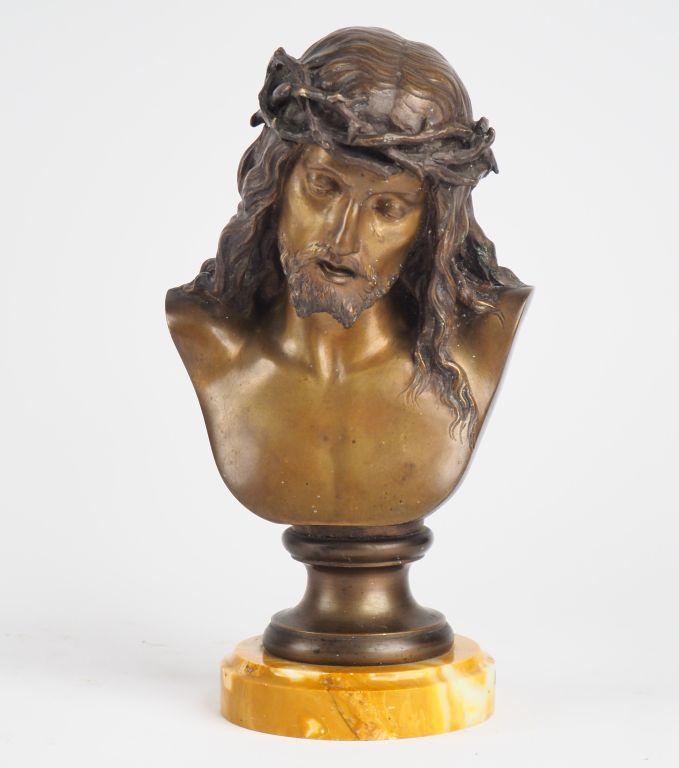 PILLET. "Christ". Sculpture en bronze à double patine sur un socle en marbre jaune. Signée. H. 27 cm.