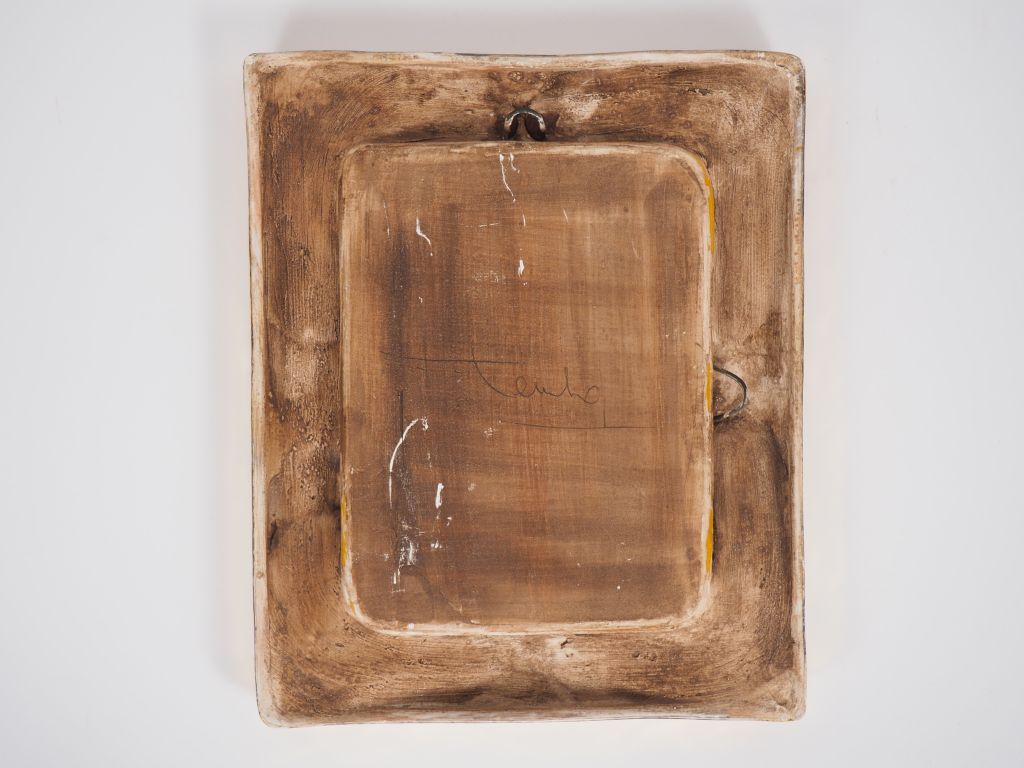 François LEMBO. Miroir en céramique polychrome et dorée à décor de cabochons. Signé Dim. 32,5 x 27 cm.