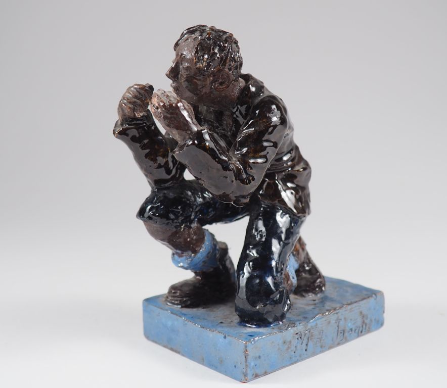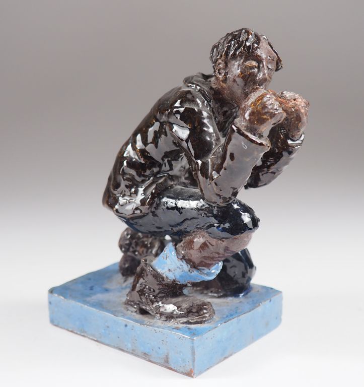 Henri Paul REY et Marcel de Jaegher. "jeune homme agenouillé" Sculpture en céramique émaillée polychrome Signée H. 13 cm