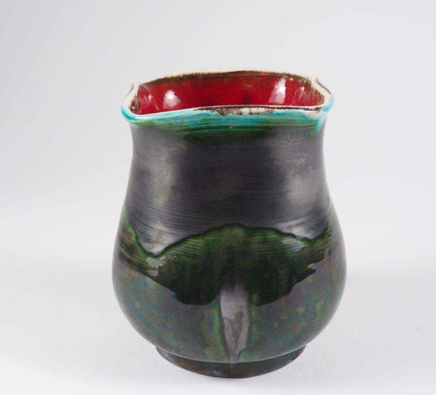 Henri Paul REY. (?) Vase en céramique lustrée noir vert et rouge, monogrammé H. 13,5 cm