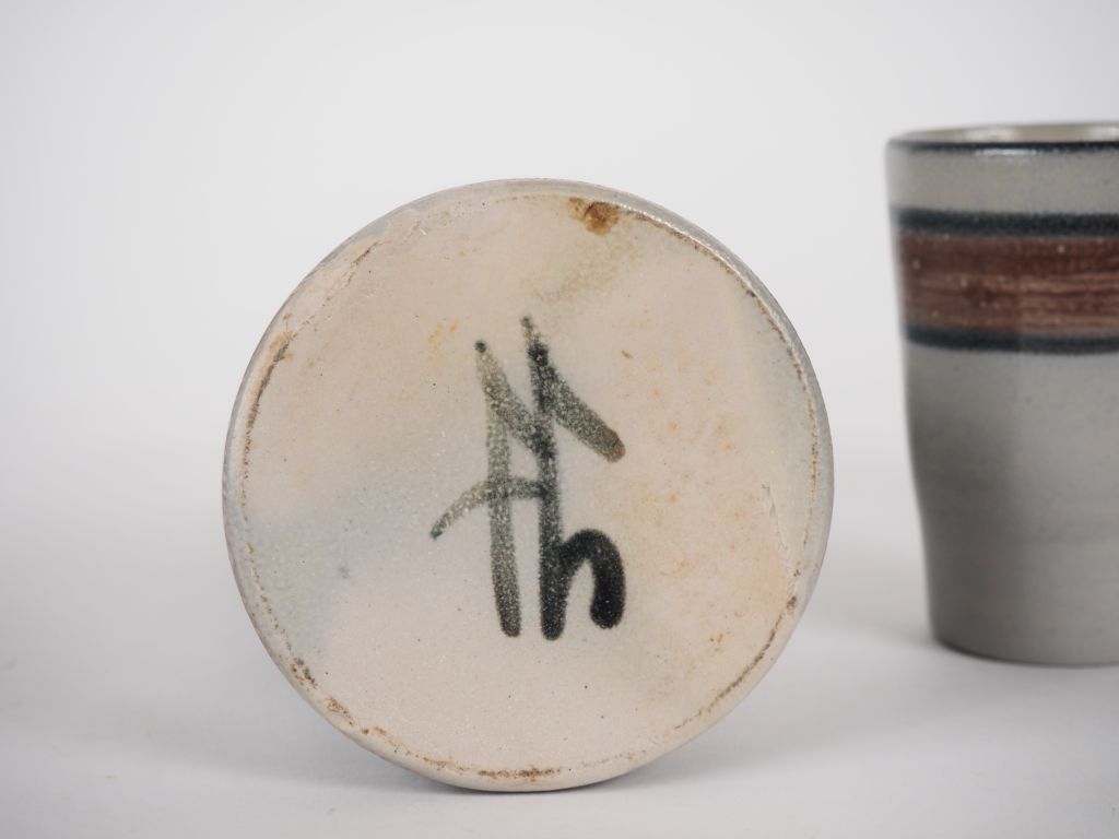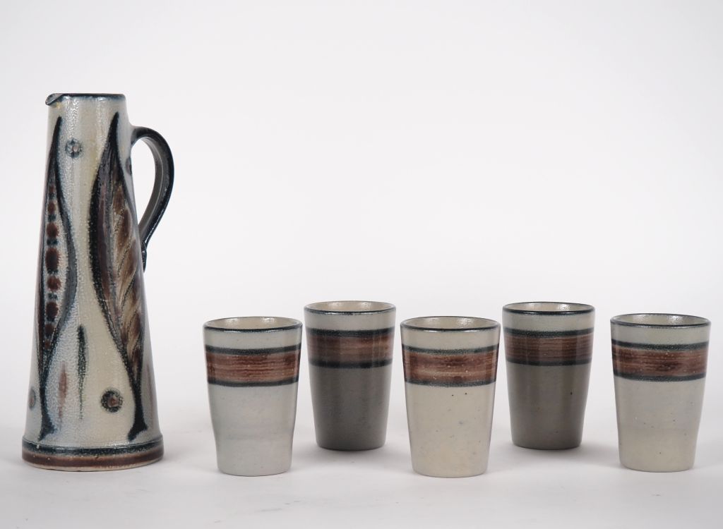 Partie de service à orangeade en grès à décor polychrome de palmes, comprenant une carafe et cinq verres.