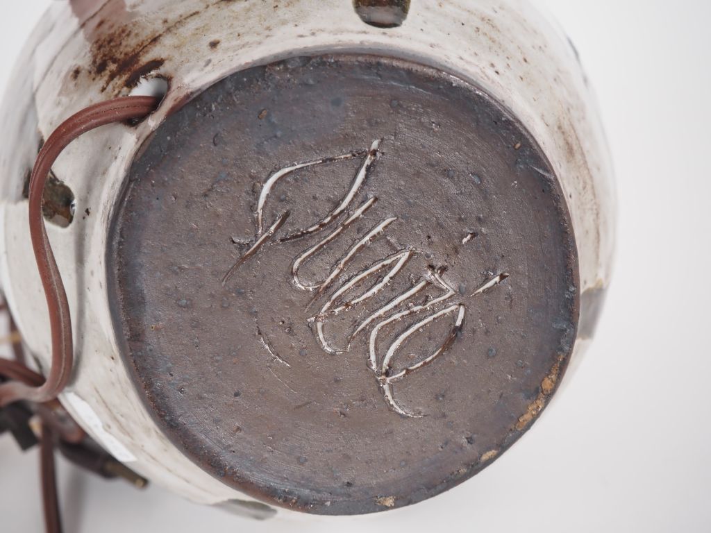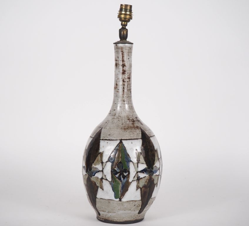 Paul QUERE. Vase en céramique polychrome à décor géométrique, monté en lampe. Signé. H. 36 cm.