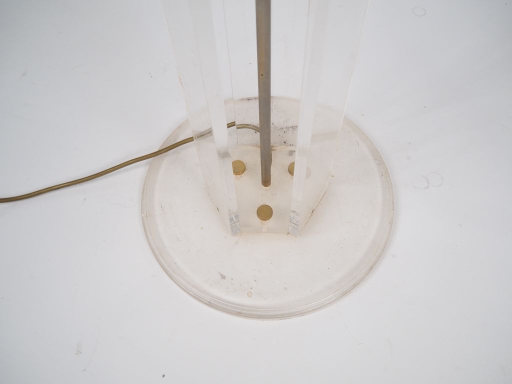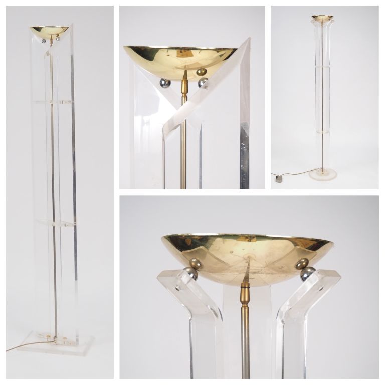 2 différents lampadaires années 70 en laiton doré et plexiglass, éclairant à une lumière halogène. H. 185 cm