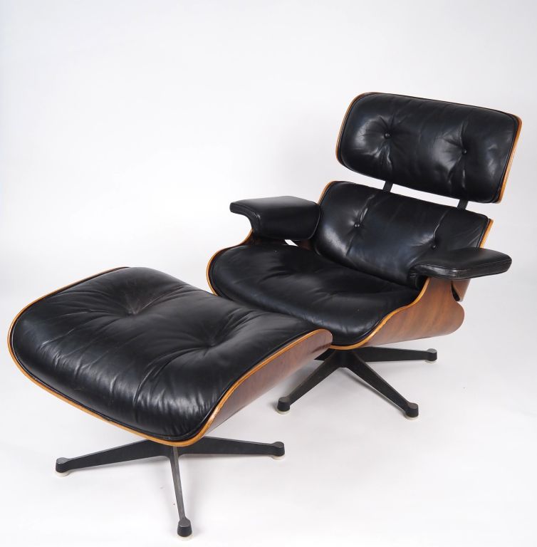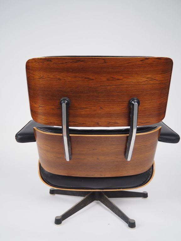 Charles et Ray EAMES pour HERMAN MILLER et Mobilier International. "lounge chair" et son ottoman, coque en bois thermoformée, piètement en aluminium, garniture de cuir noir. Porte l'étiquette Herman Miller et Mobilier international. (petites usures du cuir, notamment sur l'ottoman, sauts et frottements sur le placage).