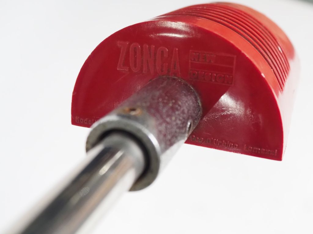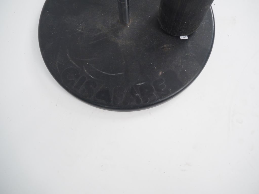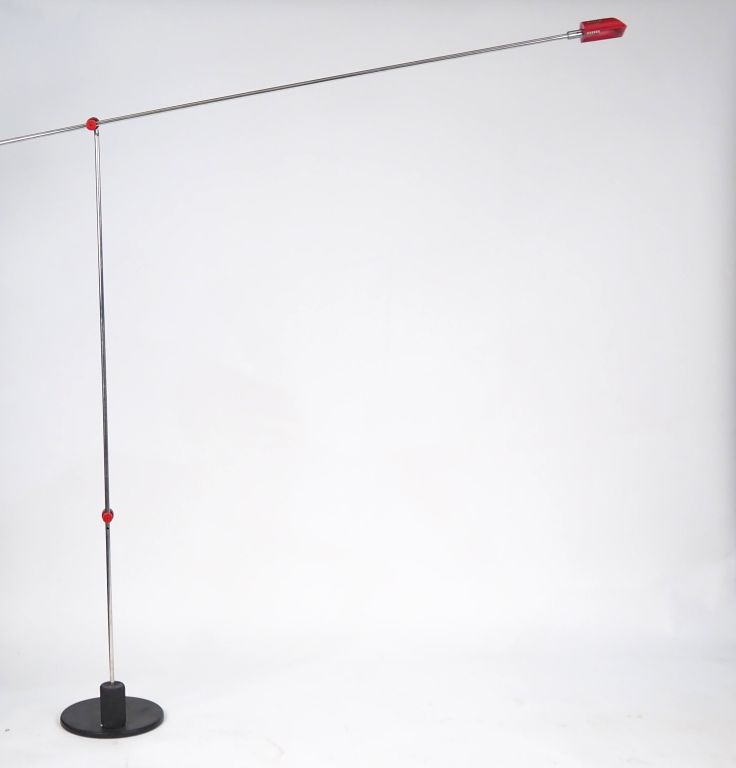 DE PAS. Lampadaire articulé "Cisafare" en métal chromé et laqué rouge, éclairant à une lumière. H. 176 cm (manques, à remonter)