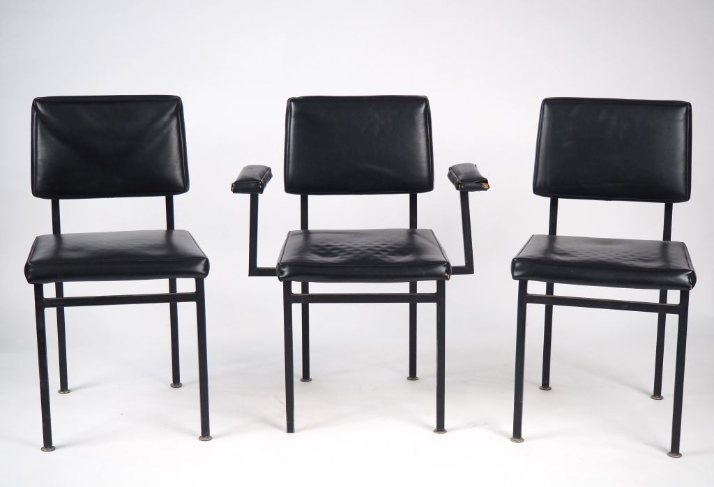 Deux chaises et un fauteuil design, garniture de simili cuir noir, assise en métal laqué noir.