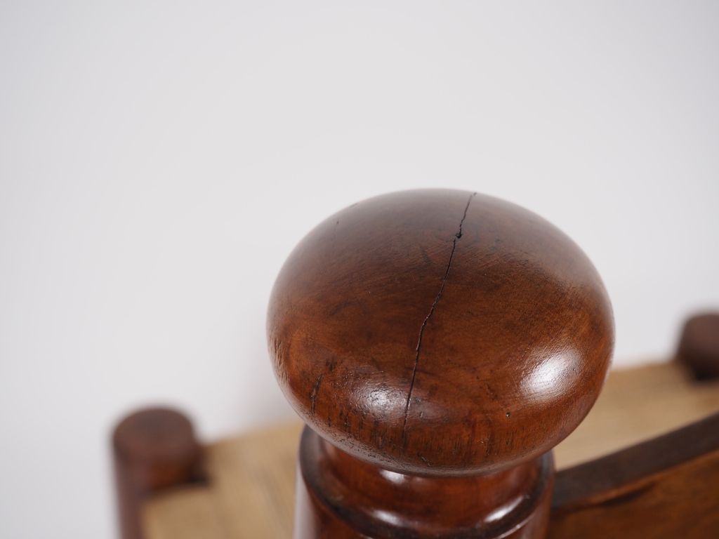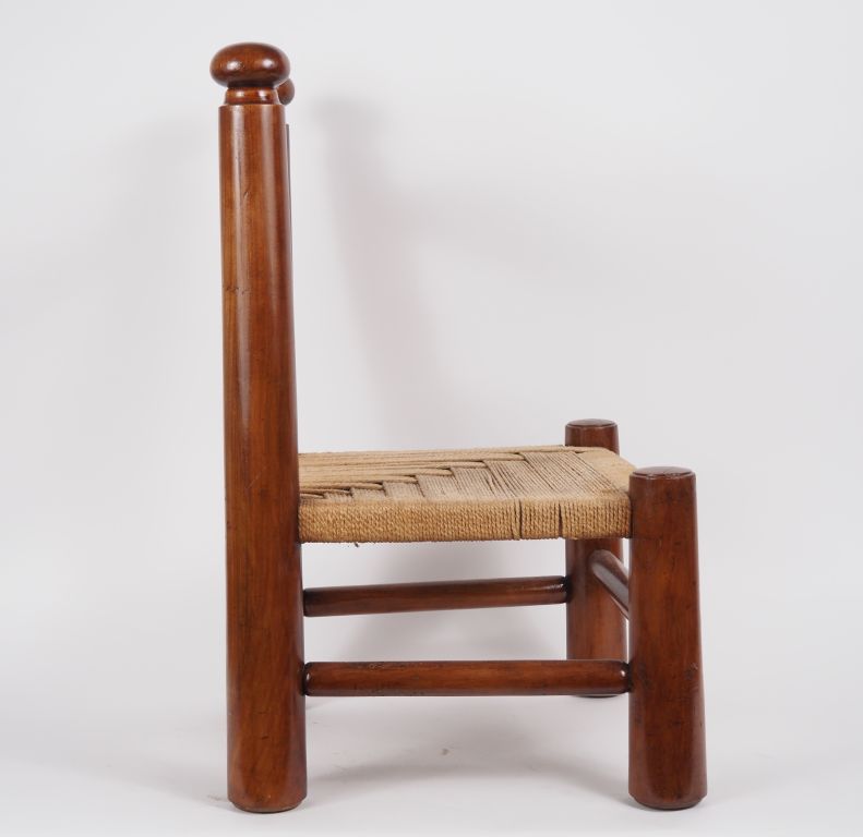 DUDOUIYT. (d'après). Chauffeuse en bois, assise en corde à décor géométrique. (restaurations) dim. 65 x 44 x 38 cm