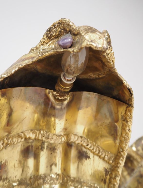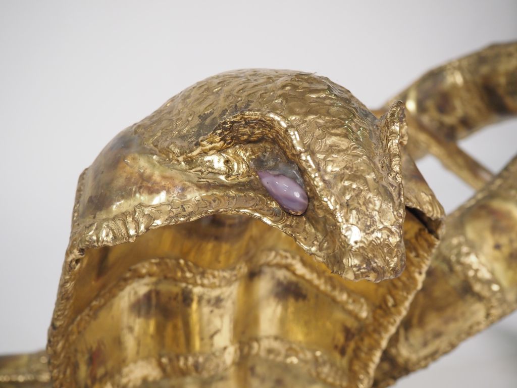 Henri FERNANDEZ. Table basse lumineuse "cobra" en laiton doré, les yeux en verroterie violette , plateau en verre fumé Dim. 37 x 107 x 63 cm