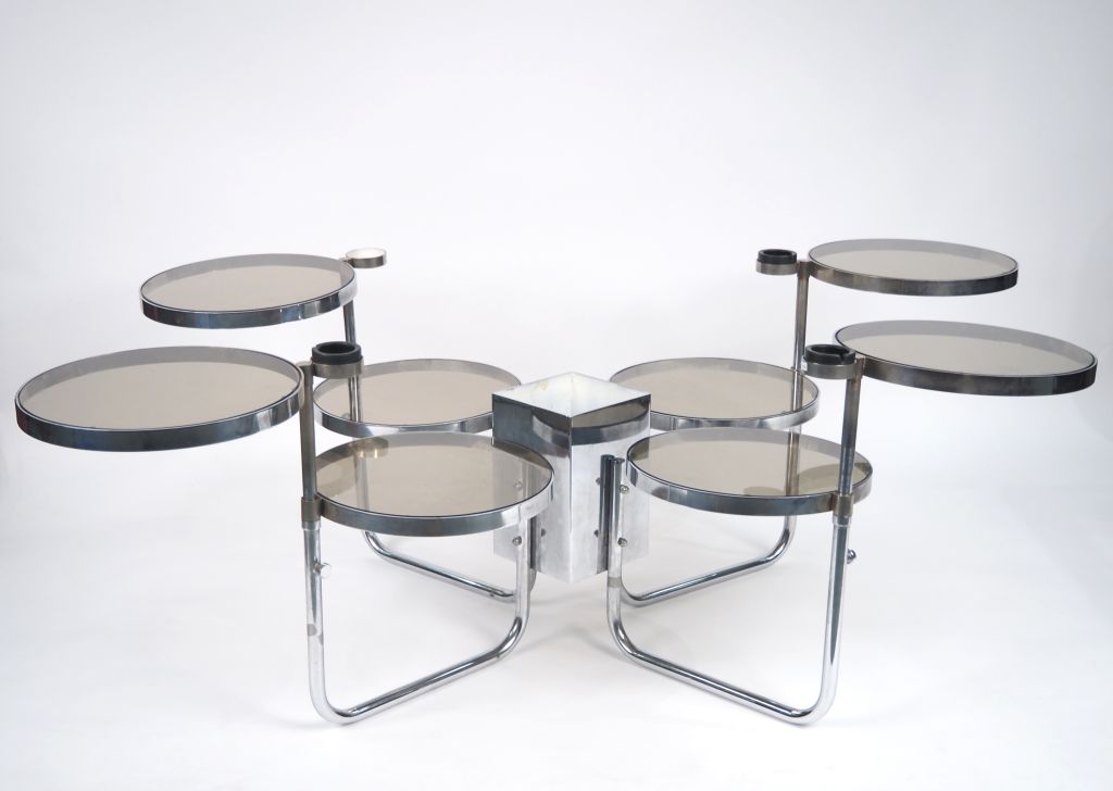 MOLINARI (?) et Franco POZZI. Table basse italienne en métal chromé verre et céramique noire, à 6 plateaux modulables, agrémentée de 4 cendriers. Signée sur les cendriers en céramique. (Un cendrier manquant). Dim. (repliée) : 64 x 95 cm.