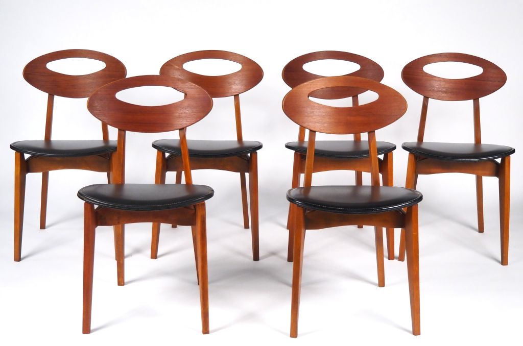 Roger LANDAULT. Suite 6 chaises 1950 en bois et cuir noir.