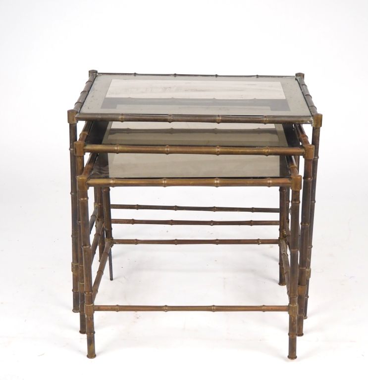 Suite de trois tables gigognes années 70 en laiton et verre, à l'imitation du bambou. Dim. 47 x 52 x 38,5 cm (oxydations et manques de laiton à un pied)
