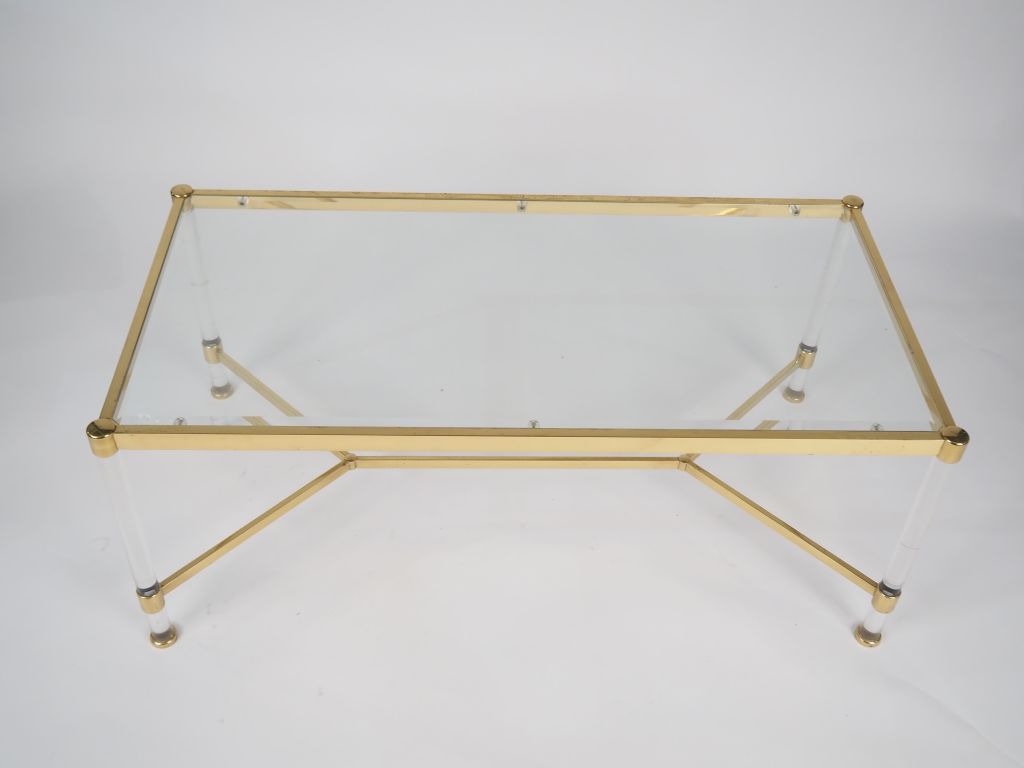Table basse années 70 en laiton doré et plexiglass, plateau verre, quatre pieds réunis par une entretoise. Dim. 45 x 111 x 57 cm