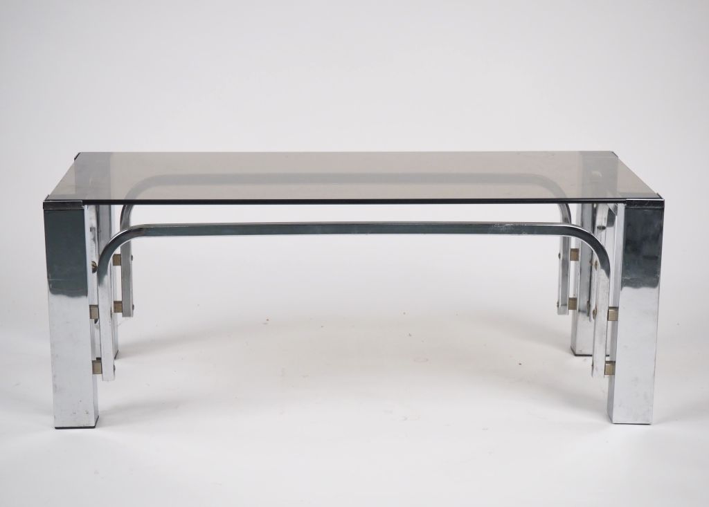 Table basse années 70 en métal chromé et verre fumé. Dim. 34,5 x 90 x ...