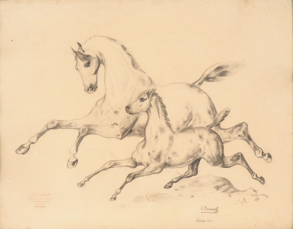 BARRIETY. "Jument et sa pouliche". Dessin signé en bas à droite et daté 1901. Dim. (à vue) : 46 x 57 cm.