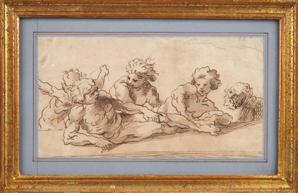 D'après un maitre italien du XVIIème. "Etude de personnages" Dessin à la plume Dim. 14 x 25,5 cm