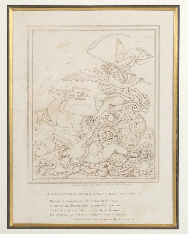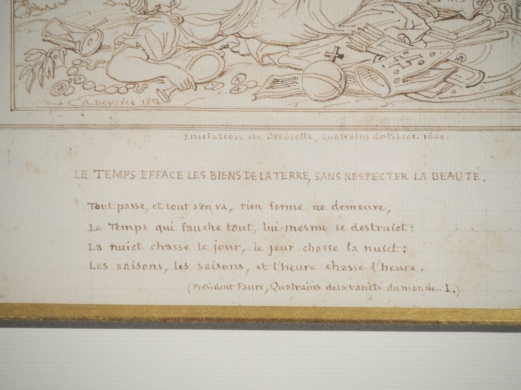 DE VERIA. "le temps efface les biens de la terre sans respecter la beauté" Dessin à la plume, signé en bas à gauche et daté 1854 agrémenté du poème : Tout passe et tout s'en va, rien faire ne demeure, le temps qui fauche tout lui-même se détruict, la nuicte chasse le jour le jour chasse la nuict : Les saisons, et l'heure chasse l'heure" (signé Président Faure, quatrins de la vanité du Monde) Dim, à vue : 26,5 x 22 cm